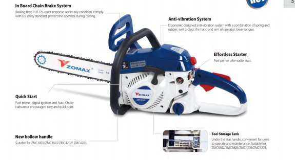 Special ergonomic designs for the chock under three grades for open/seml- open/closed to simpfy starting and stopping the machine. Ideal for any kinds of agricultural usages such as lopping, cllcting firewood, fling and ctting up medium to large sized timber.